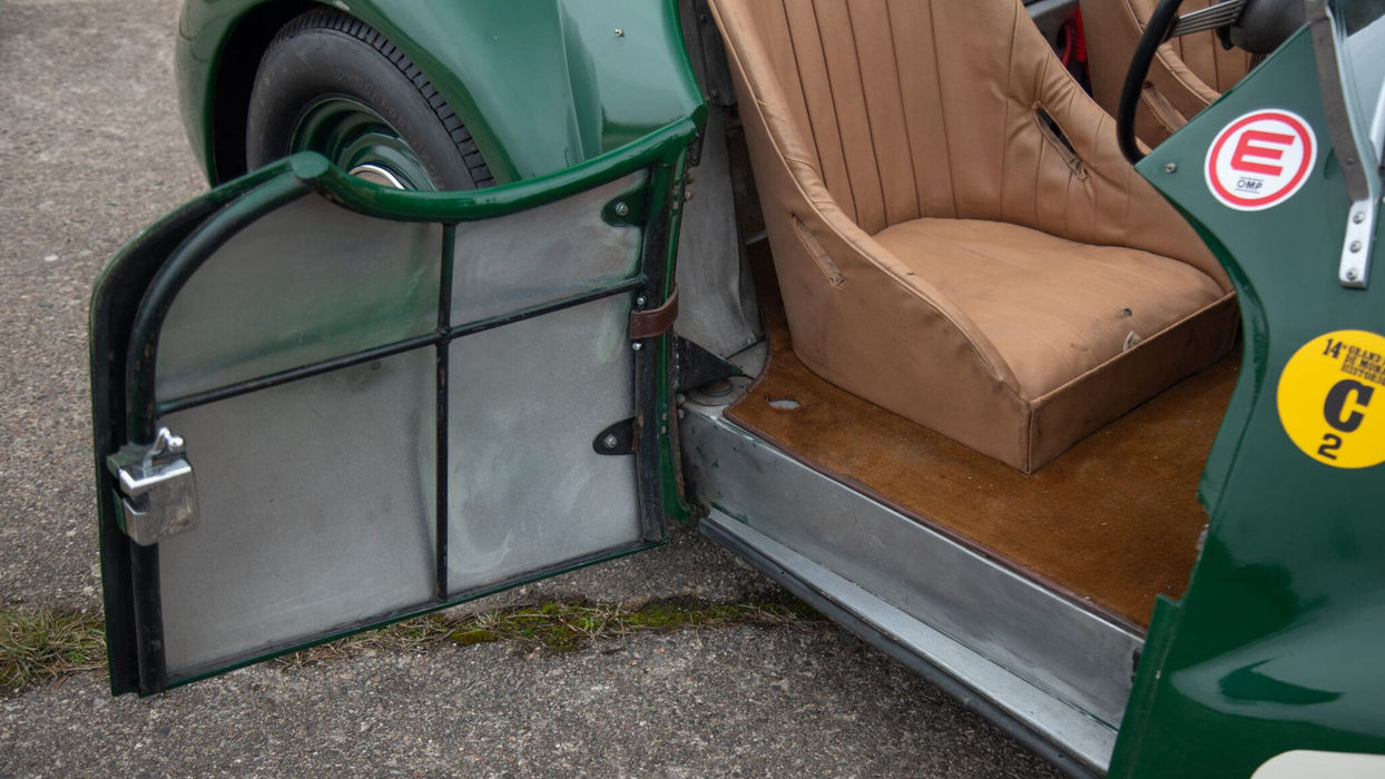 The L2 utilised the proven chassis and running gear of the contemporary Lea-Francis sports models, clothed in a lightweight aluminium body of purposeful simplicity. Beneath the bonnet sits the characterful Lea-Francis four-cylinder engine, later enlarged in period to 2,496cc, providing a notable increase in performance while remaining entirely sympathetic to the car’s early competition heritage. In this form, the L2 was capable of performance well in excess of 100 mph, an impressive figure in the late 1940s and testament to the car’s advanced engineering. It was campaigned extensively in the UK by first and second owners P.L. Jonas and E.N. Petch before passing to Dr Arthur Goldthorpe in 1952. Like his predecessors, Goldthorpe raced ‘AHC 82’ at Goodwood on numerous occasions, competing wheel-to-wheel against the likes of Frazer-Nash Bristols, BMW 328s and Healey Silverstones.